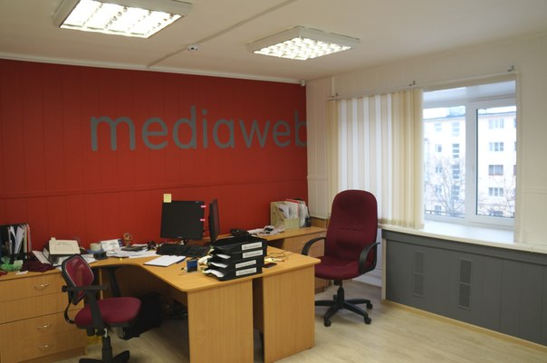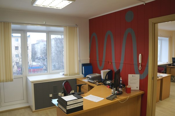 В приемной и одном из кабинетов офиса появились стенки с фирменной символикой.